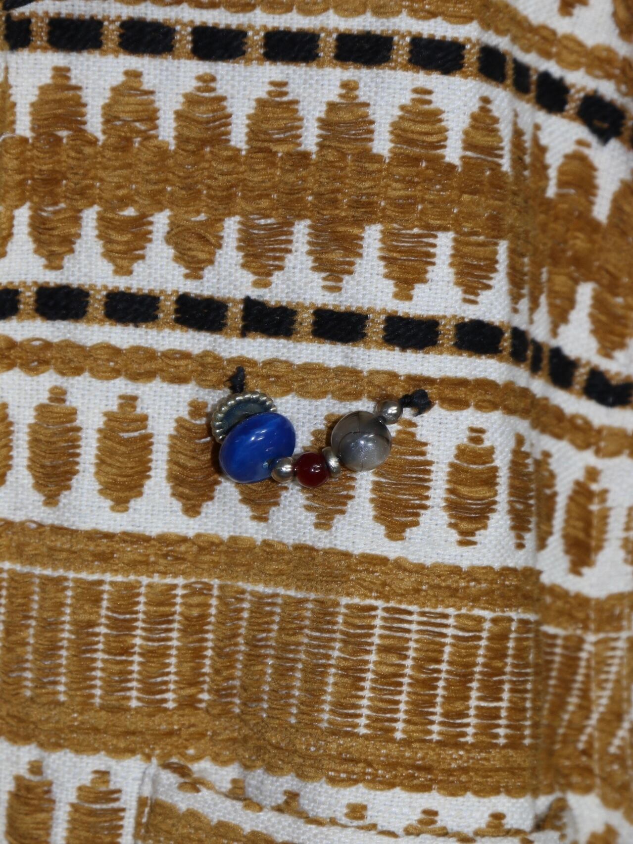 胸元には現地のマーケットを巡って集めたレジンビーズをアソートで手縫いし旅の記憶を込めました。