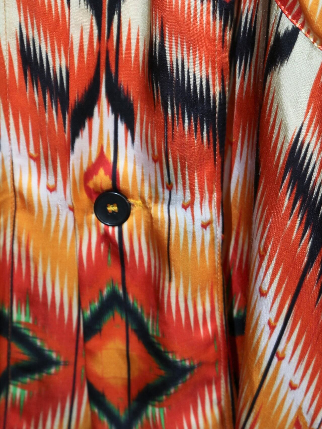 とろみのあるレーヨン素材イカット柄をプリントしたコンフォートな生地です。恐らく元々あるイカット素材の織り方をデータ化してプリントしているものだと思われます。日本の暑い夏には最適かつ、暑さを吹き飛ばしてくれる溌剌としたナイス配色。