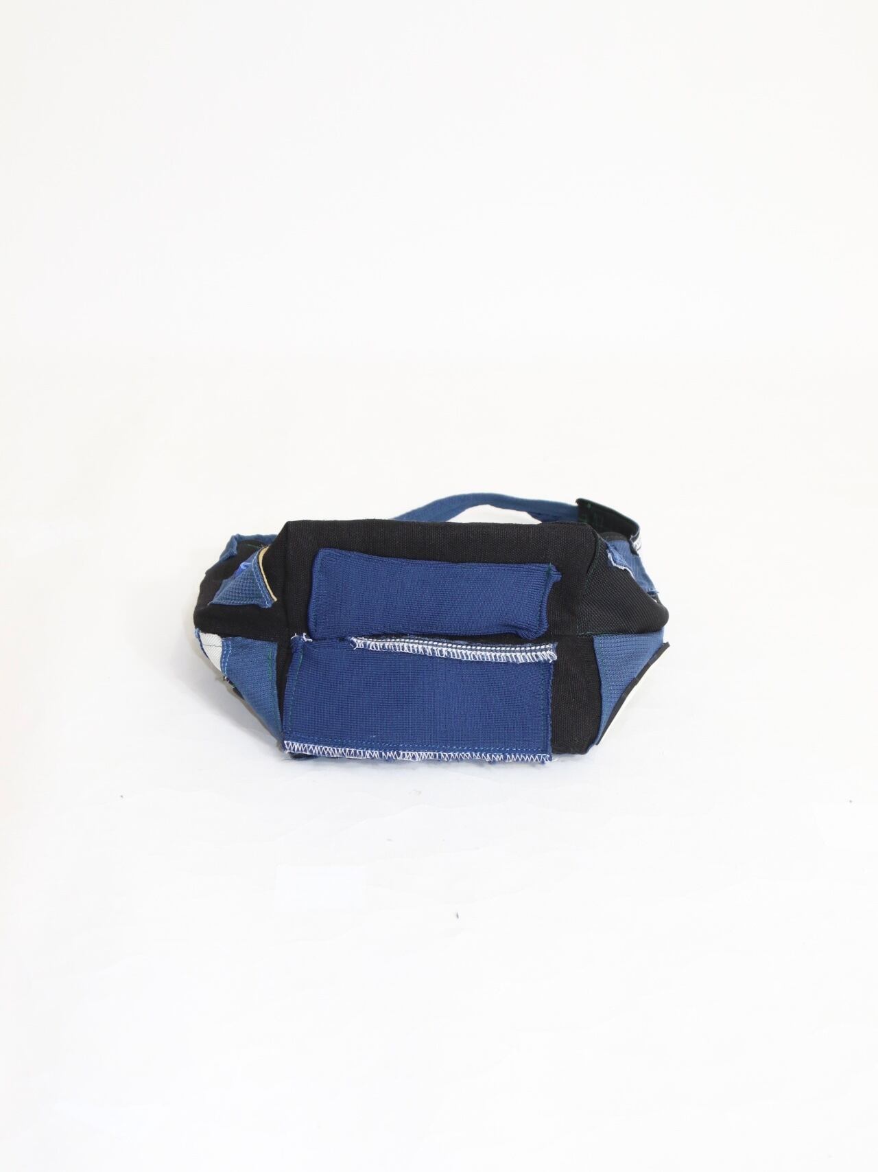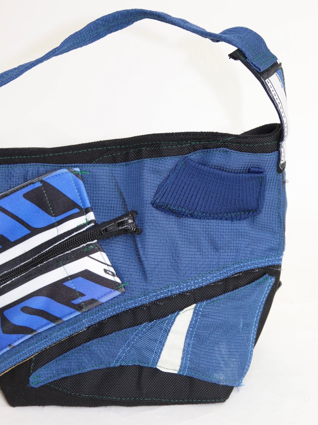 モトクロスパンツを解体し、メーカーロゴや特有のパーツを活かしミニワンストラップバックを作りました。裏地にはコットンキャンバス生地を採用しています。