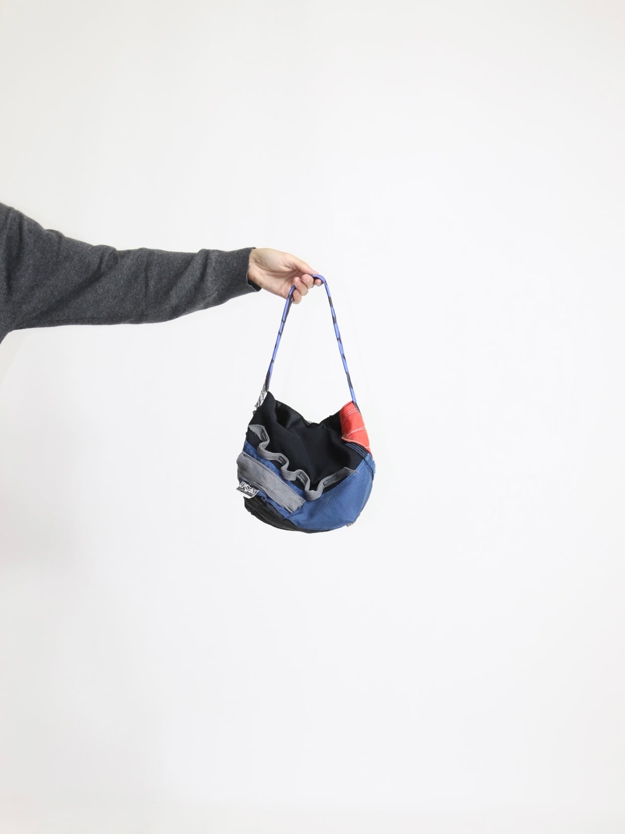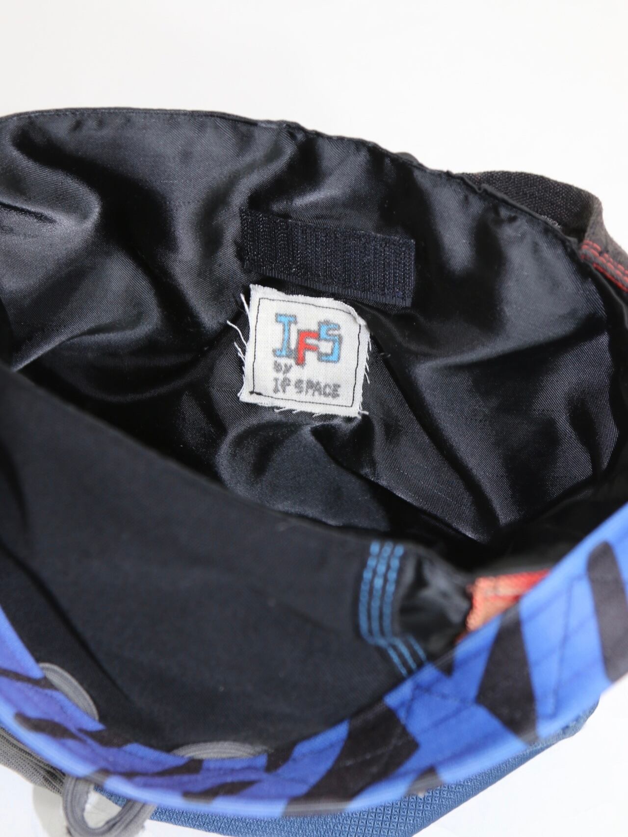 モトクロスパンツを解体し、メーカーロゴや特有のパーツを活かしミニワンストラップバックを作りました。裏地は古着のサテンジャケットを解体した生地を採用しています。