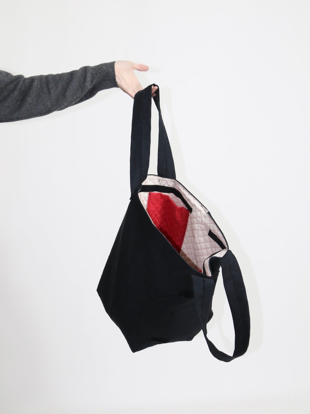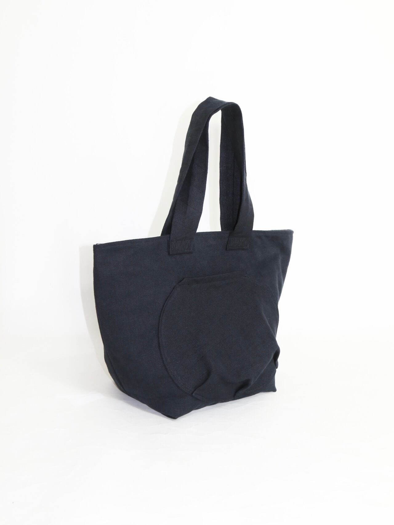 True to its name, this tote bag presents itself as simple at first glance. A circular outer pocket with three gyoza-like tucks subtly disrupts its minimal form, while two utility pockets are placed inside. Washed cotton canvas is used for both the handles and the main body. The lining features red quilted fabric, deliberately applied inside out. The design reveals its character through details that are easy to miss—precise stitch work and restrained construction—resulting in a tote that is quietly distinctive. In accordance with the product’s concept, no brand tag is attached.