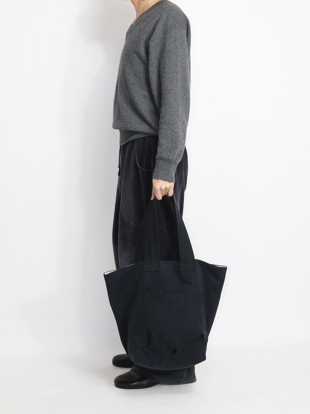 名前の通り一見シンプルなトートバッグを制作しました。外側に餃子のような3タックが入ったサークル状のポケットを施し、内側にはユーティリティポケットを2つ付けた仕様です。持ち手とメインファブリックには洗いをかけたコットンキャンバス生地を使用。裏地のメインファブリックは赤キルティングを裏使いにしています。見えにくいですがステッチワークにも拘った分かりにくくかっこいいトートバッグです。商品名に基づいてブランドタグはあえて付けていません。