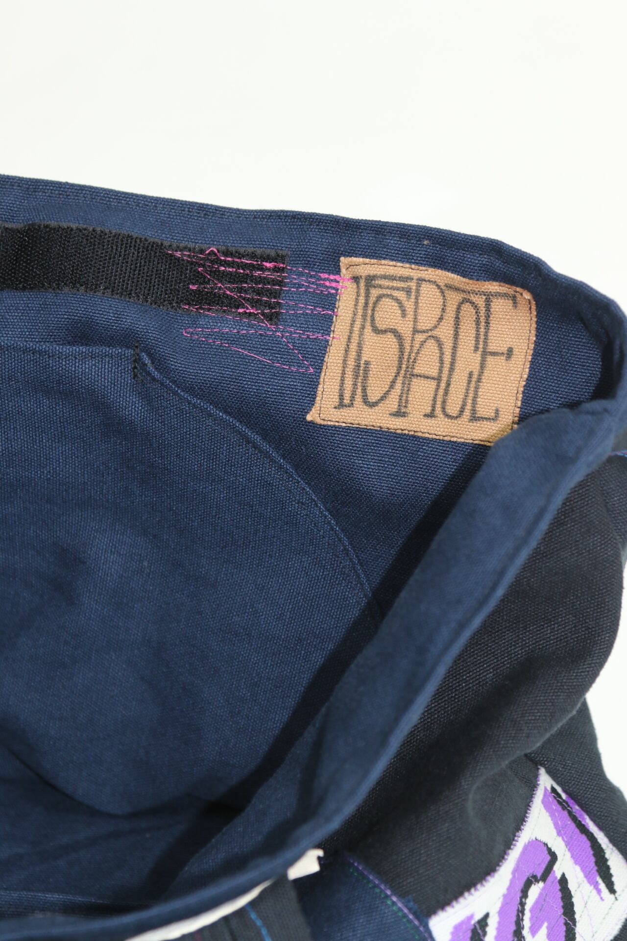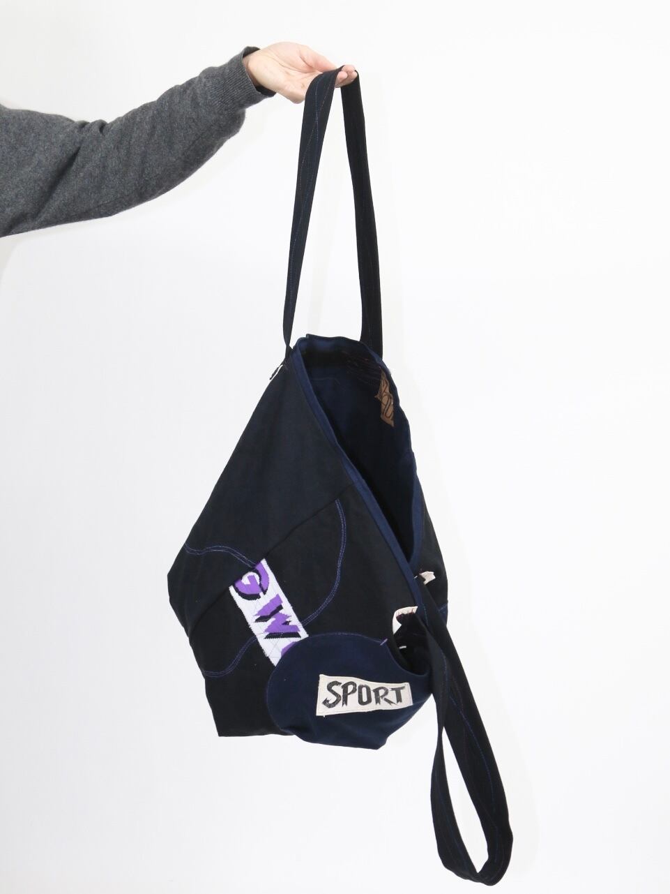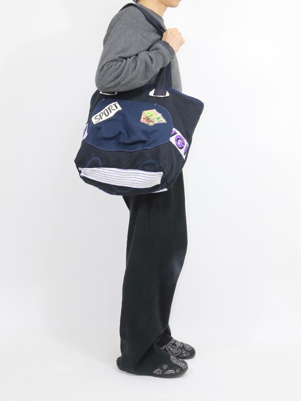 その名の通り一見シンプルなトートバッグ型です。解体したモトクロスパンツからパーツ取り出し随所に散りばめています。