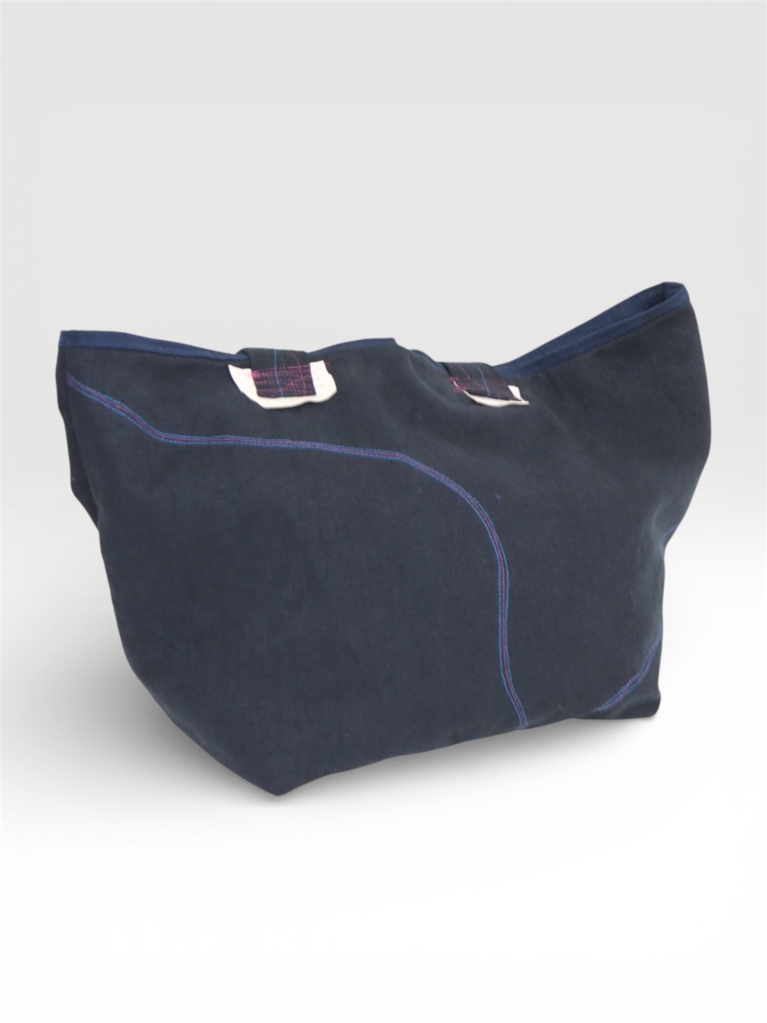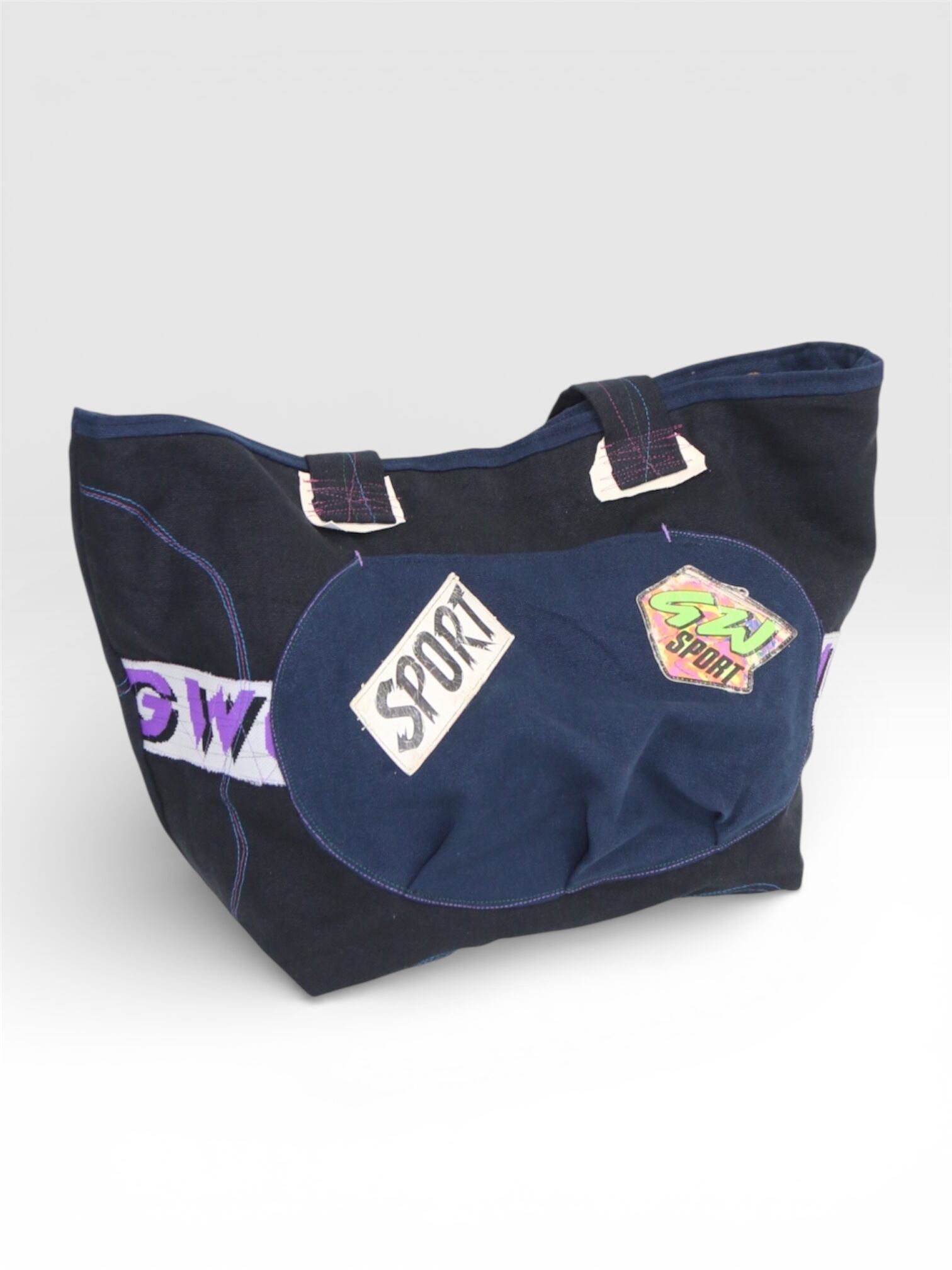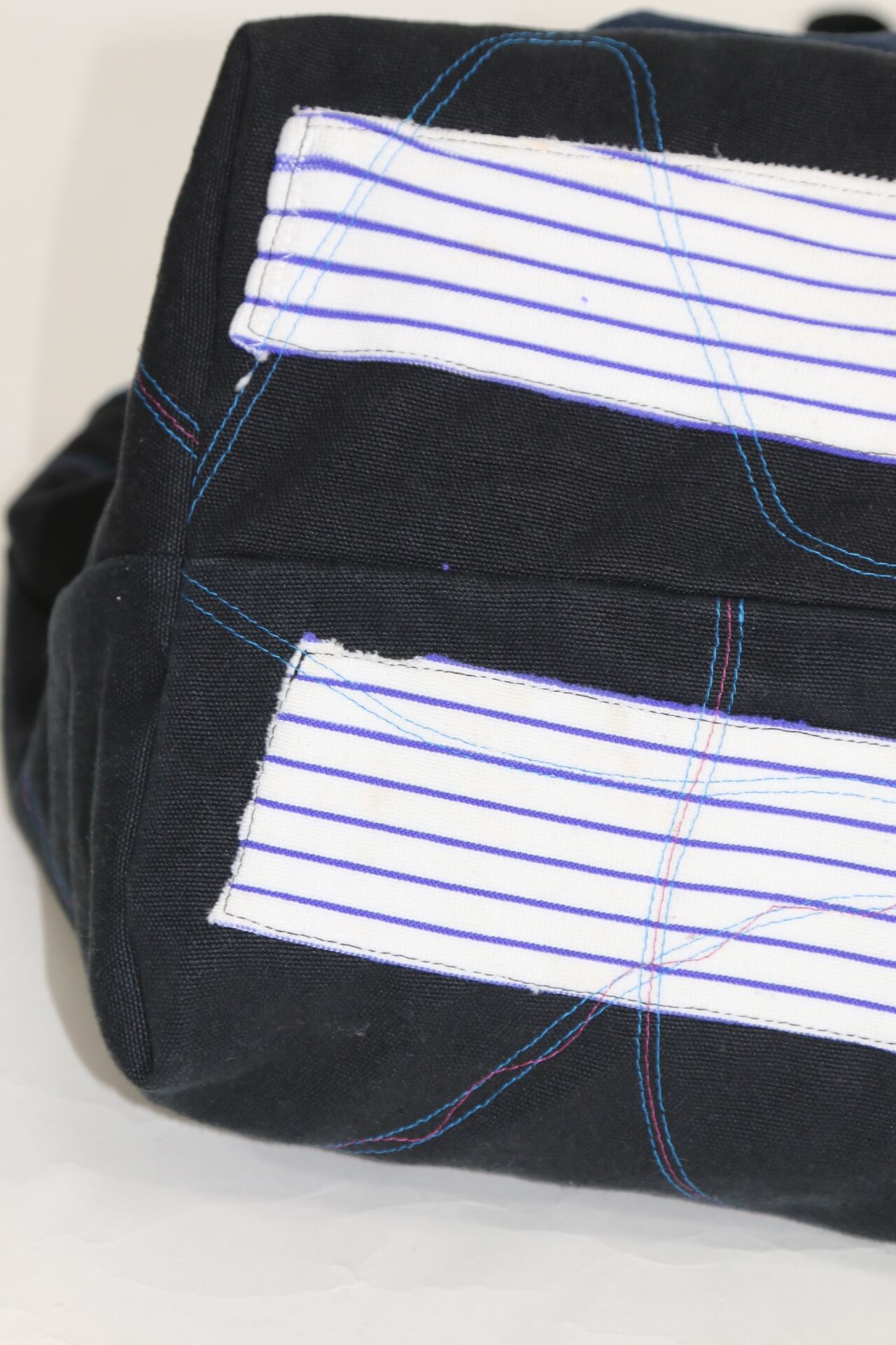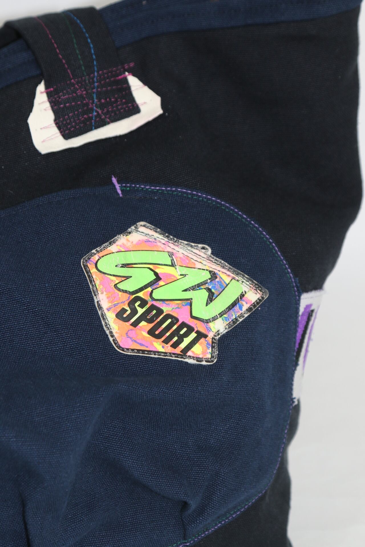 その名の通り一見シンプルなトートバッグ型です。解体したモトクロスパンツからパーツ取り出し随所に散りばめています。