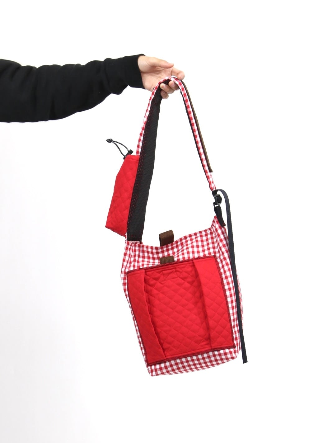 A one-strap bag made from cotton gingham check fabric.